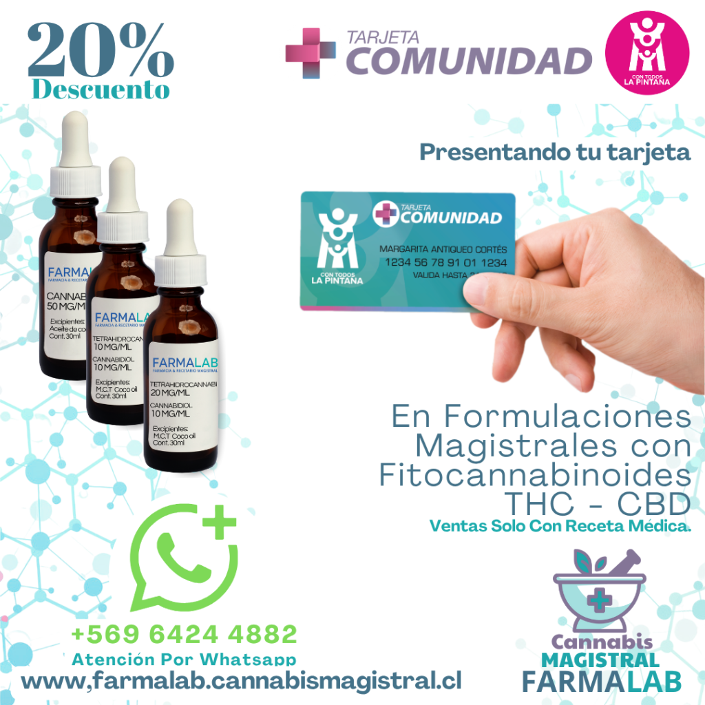 - 20% de descuento en el formulaciones magistrales con Fitocannabinoides THC – CBD.
